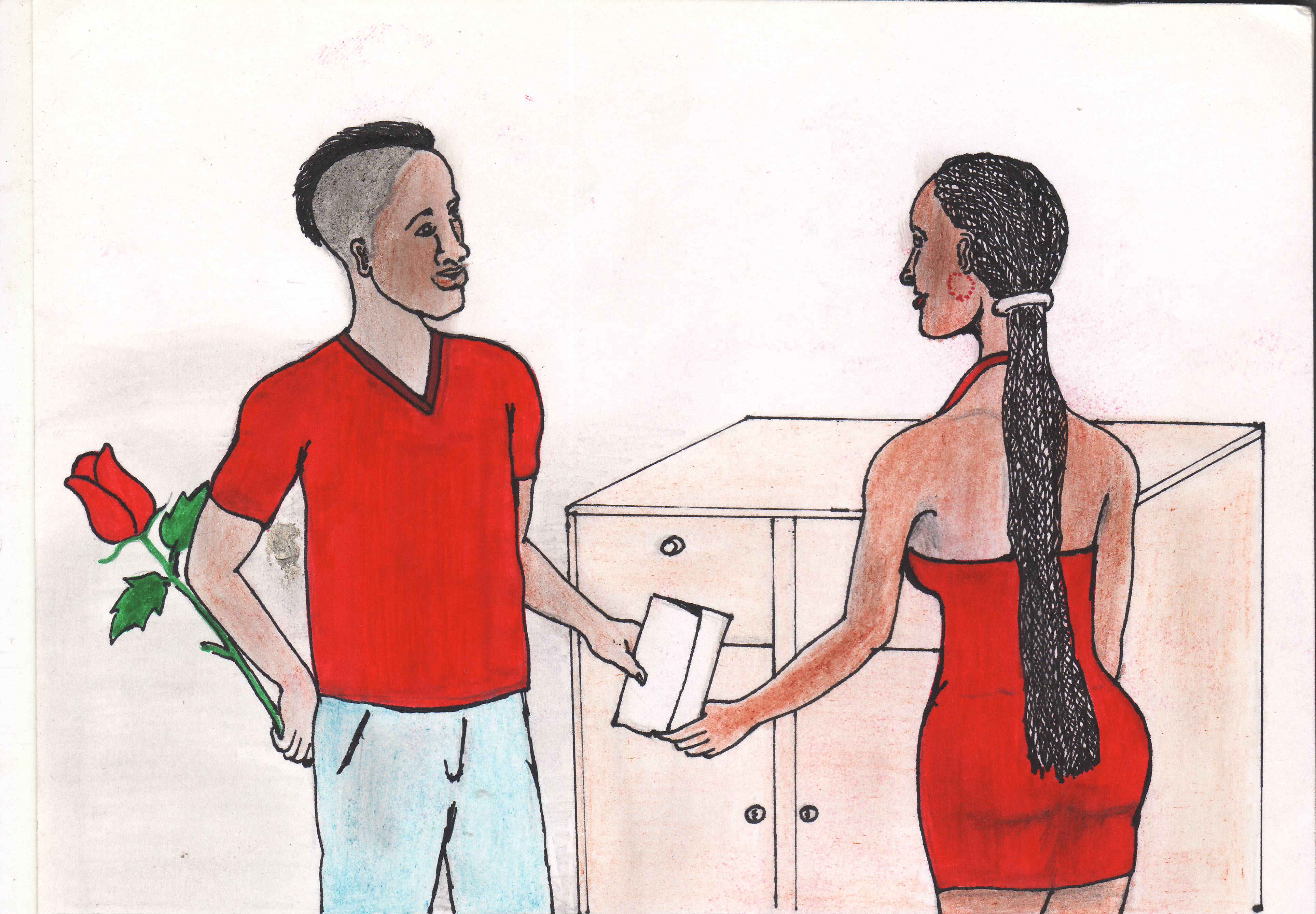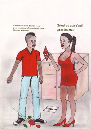 Je la fit venir à la maison en lui annonça, que j’avais un présent pour elle. Elle se pointa plus belle que jamais. Je fus envahi une fois de plus par ses prémonitions qui m’assaillent au tout profond de la nuit. Comme : « man cette fille est trop ravissante pour toi », « tu le perdras tôt ou tard », « hé man, il y a des mecs fortunés qui la drague ». Je souris niaisement tout en me disant qu’aujourd’hui c’est moi sans savoir que je n’irai point au soir. Je la pris par les mains et l’embrassa sur la joue gauche comme on le faisait au matin de notre relation. « Où est mon cadeau ? » fut sa toute première phrase. Je pris sur le buffet, cette jolie enveloppe bourrée de cœurs et des mots pour le cœur.